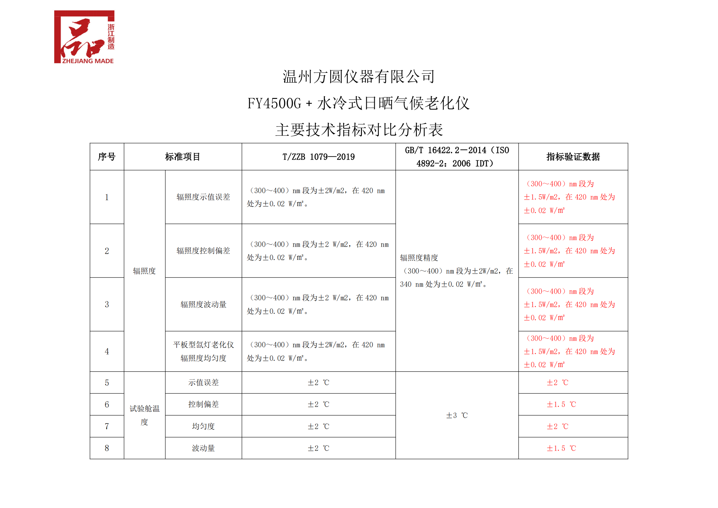 FY4500G﹢水冷式日曬氣候老化儀主要技術(shù)指標(biāo)對比分析表